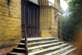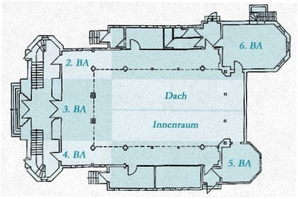 | 3. Bauabschnitt | - Säuberung und Sanierung Mauerwerk - Neubau Eingangstreppe mit Rost und Geländer - Reparatur der Uhr - Aufarbeitung der Türen (straßenseitig) - Aufarbeitung der Lampen einschließlich Anschlüsse - Baubeginn: 2001 - Kostenpunkt: 83.000.- DM |